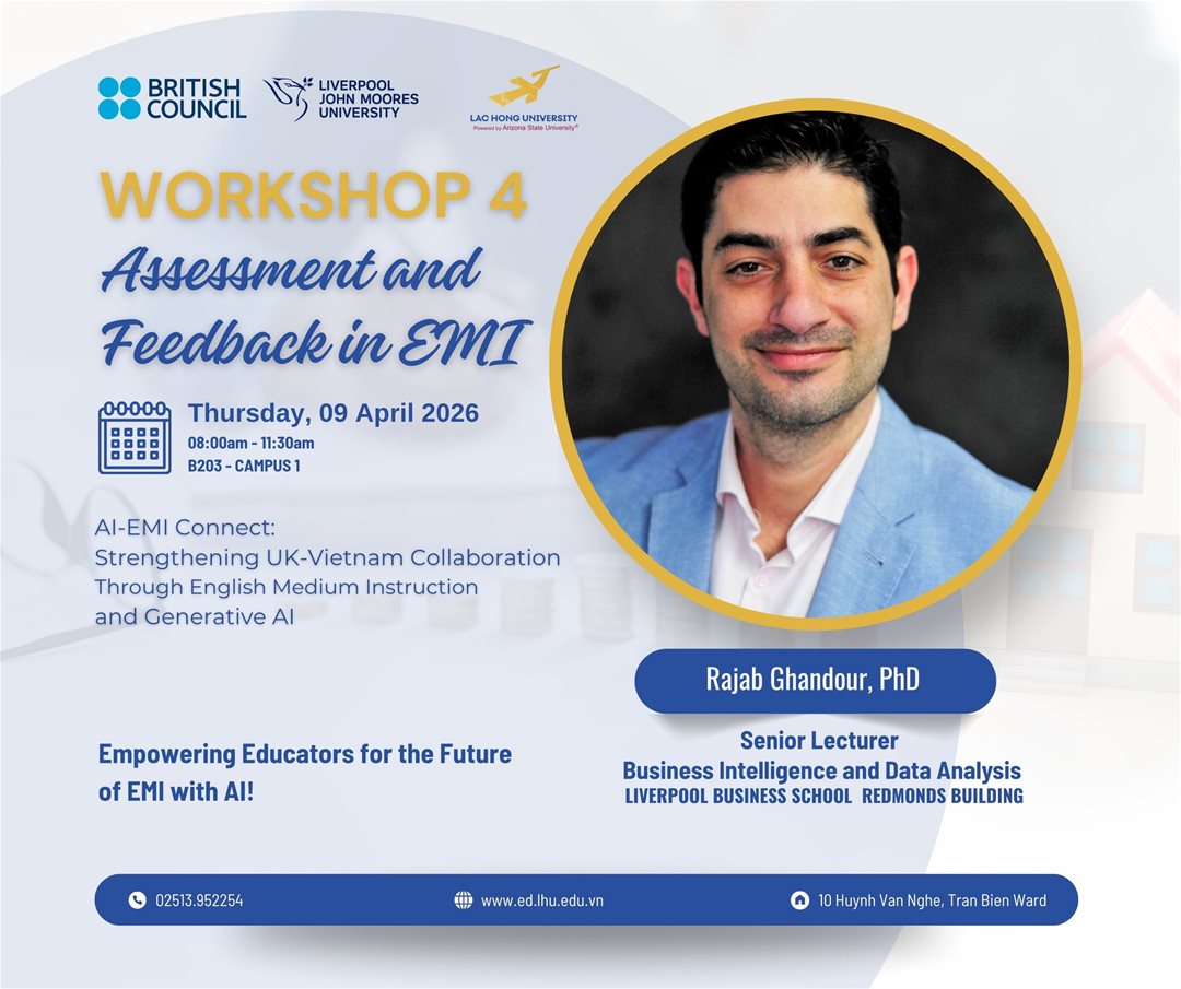 Trong khuôn khổ dự án hợp tác giữa Đại học Liverpool John Moores (Vương quốc Anh) và Trường Đại học Lạc Hồng, Khoa Ngôn ngữ Anh trân trọng tổ chức buổi Workshop chuyên sâu mang tính thực tiễn cao dành cho đội ngũ giảng viên và học viên cao học.