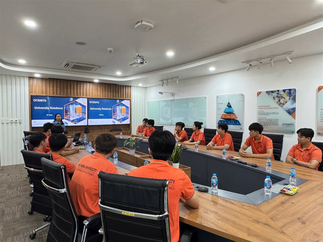 Tại buổi tham quan, sinh viên đã được đại diện Onsemi giới thiệu tổng quan về quy trình đóng gói (packaging) và kiểm định (testing) chip bán dẫn – những công đoạn quan trọng quyết định đến độ tin cậy, hiệu suất và chất lượng của sản phẩm trước khi xuất xưởng. Bên cạnh đó, sinh viên cũng có dịp quan sát trực tiếp dây chuyền sản xuất hiện đại, vận hành trong môi trường cleanroom tiêu chuẩn cao, nơi mỗi công đoạn đều được kiểm soát chặt chẽ bằng hệ thống tự động hóa tiên tiến.