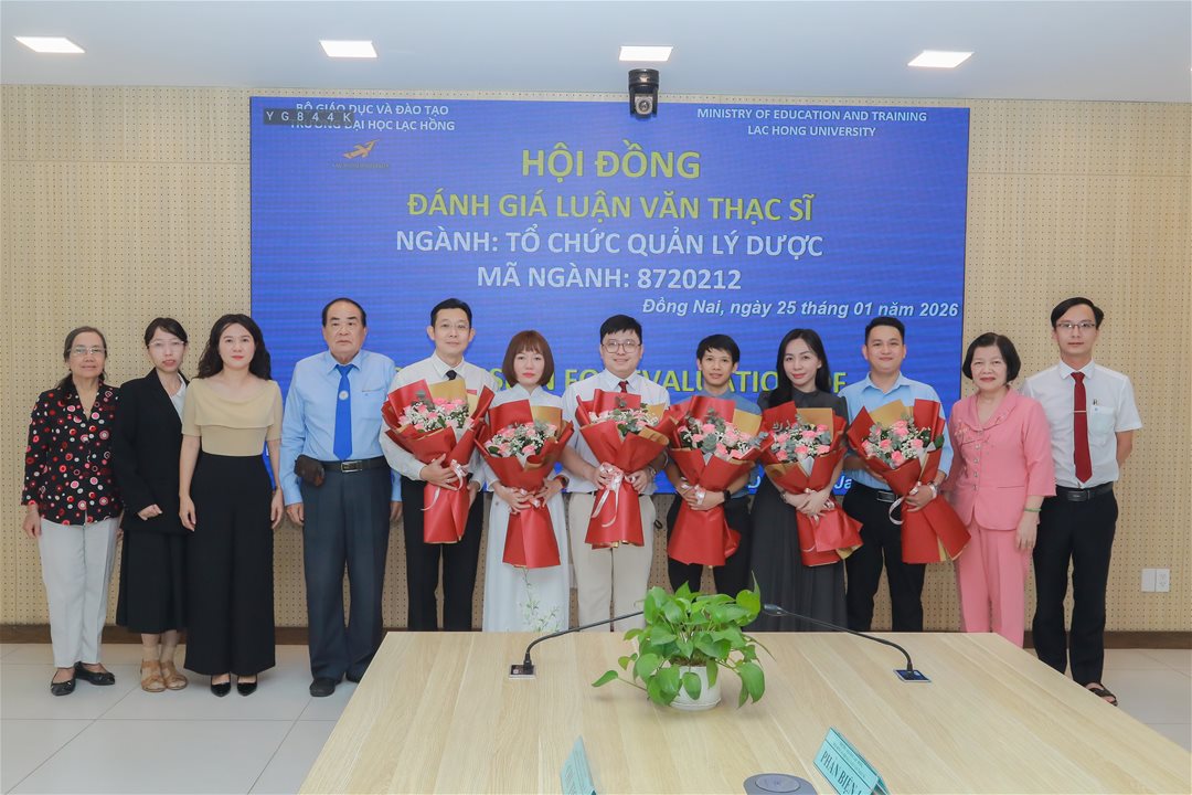 Ngày 25 tháng 01 năm 2026, tại phòng họp cơ sở 1 của Trường Đại học Lạc Hồng (LHU), 06 học viên thuộc ngành Tổ chức quản lý dược đã hoàn thành phần trình bày và bảo vệ luận văn thạc sĩ trước hội đồng chuyên môn. Buổi bảo vệ diễn ra trong không khí trang nghiêm, học thuật và chuyên nghiệp, đánh dấu cột mốc quan trọng trong quá trình đào tạo sau đại học tại nhà trường.