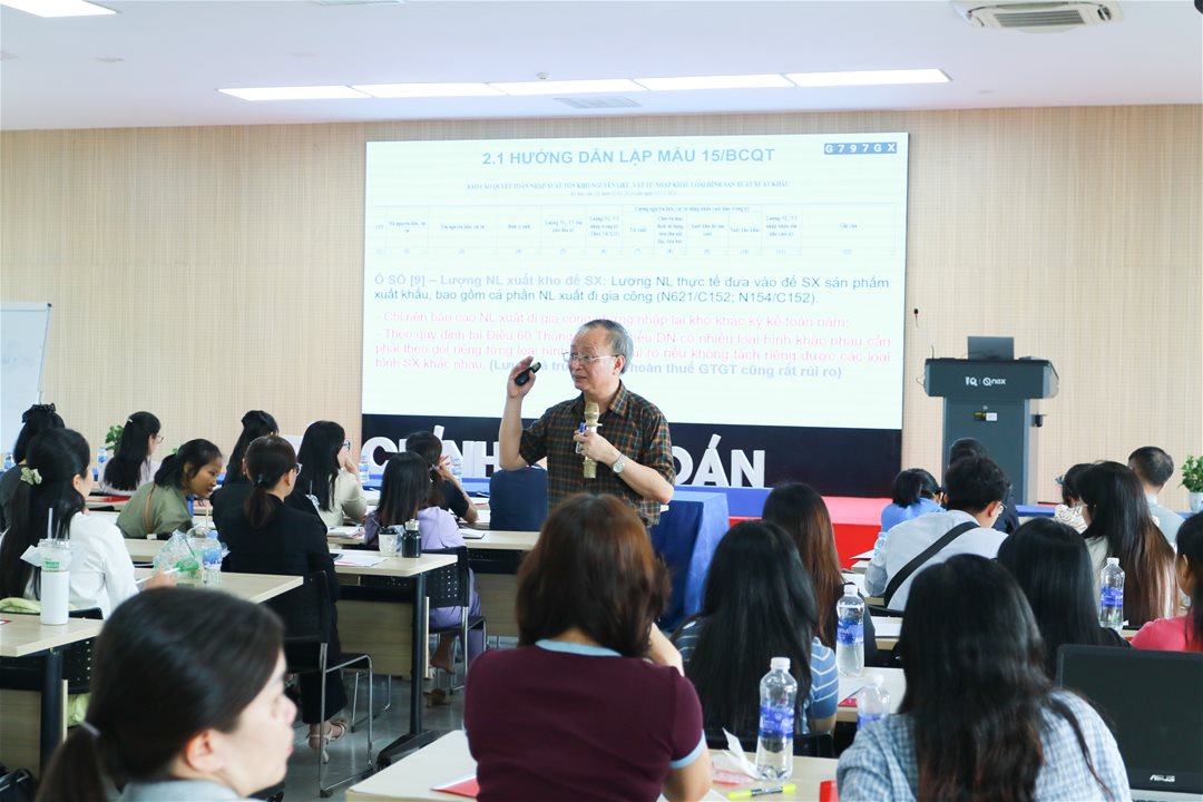 Trong phần trình bày, diễn giả đã phân tích các quy định mới liên quan đến quyết toán nguyên phụ liệu nhập khẩu, đồng thời hướng dẫn sinh viên vận dụng văn bản pháp luật vào thực tế doanh nghiệp, từ đó hiểu rõ hơn các bước xử lý chứng từ, kiểm tra số liệu, lập báo cáo quyết toán và ứng dụng công nghệ trong quản lý kế toán xuất nhập khẩu.