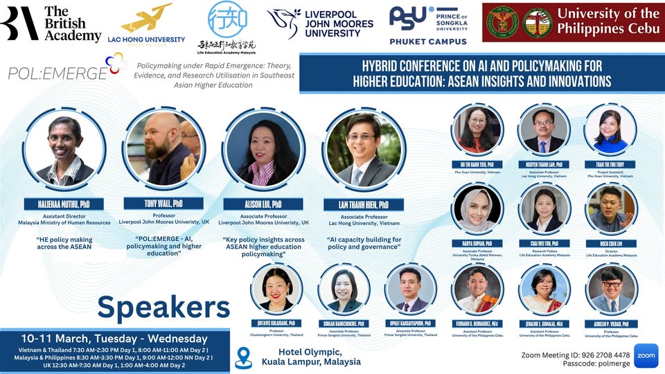 Ngày 10–11/3/2026, hội nghị hybrid “AI and Policymaking for Higher Education: ASEAN Insights and Innovations” diễn ra tại Kuala Lumpur (Malaysia) kết hợp trực tuyến, thu hút 40 đại biểu tham dự trực tiếp và 156 người tham dự trực tuyến từ các trường đại học và tổ chức nghiên cứu thuộc 5 quốc gia thuộc Đông Nam Á.