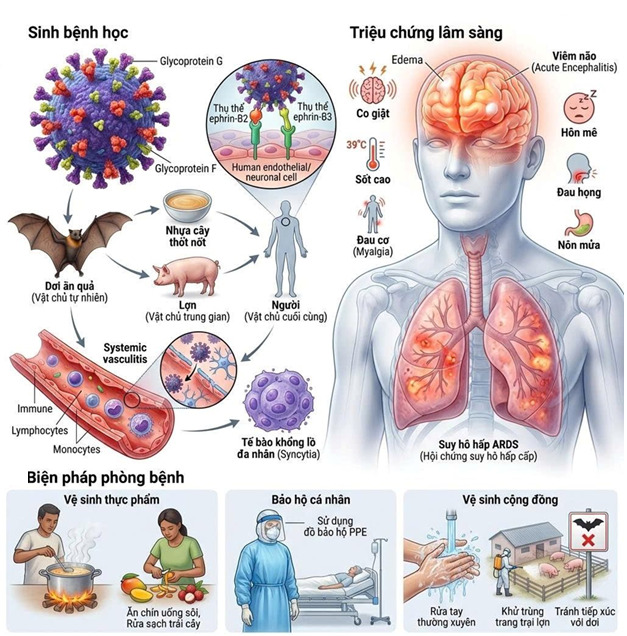 • Vật chủ tự nhiên: Dơi ăn quả (chi Pteropus, hay còn gọi là dơi ngựa) là nguồn chứa virus chính. Dơi không bị bệnh nhưng thải virus qua nước bọt, nước tiểu và phân.